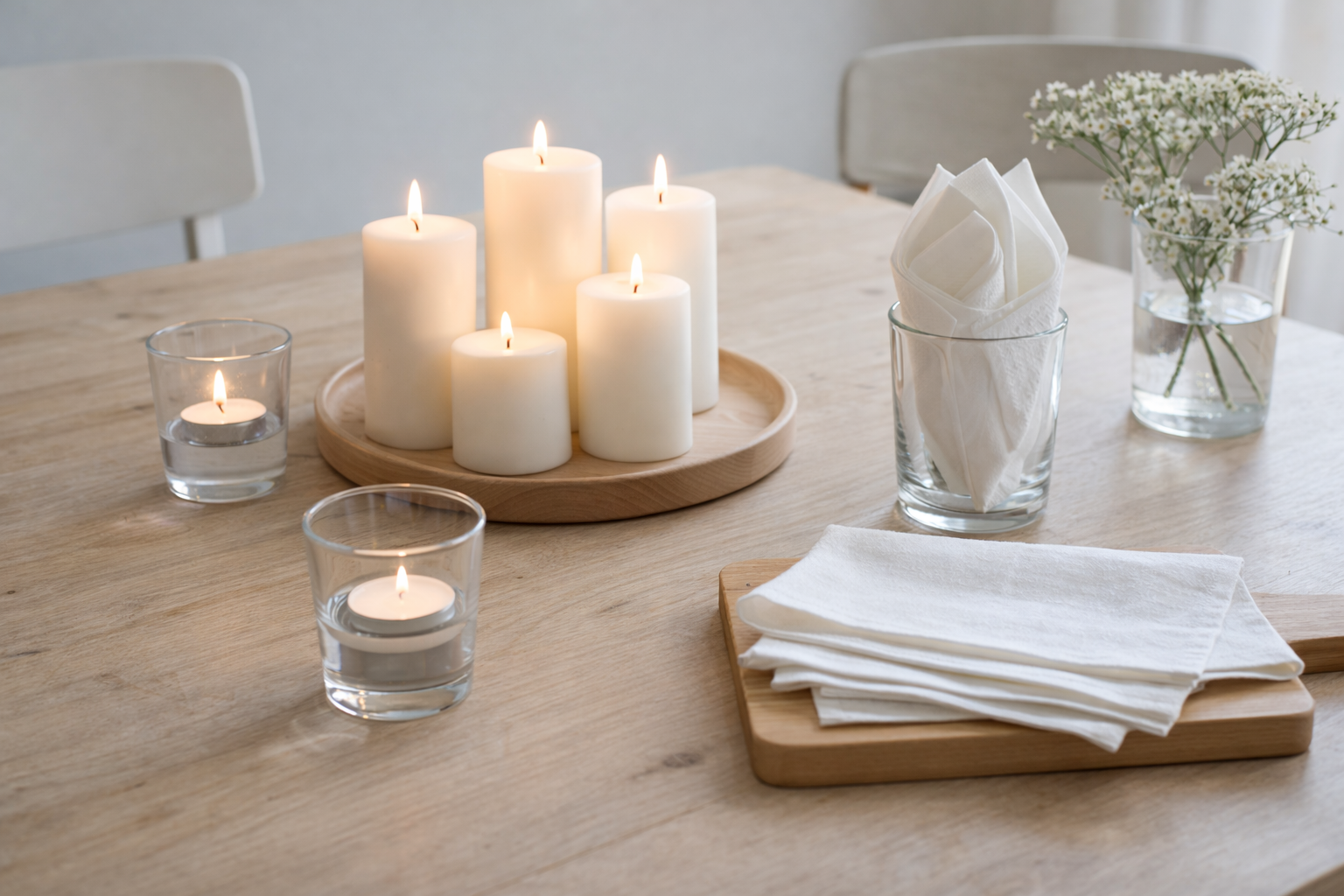 Astuce : Si tu as quelques éléments de déco neutres à portée de main pour des invités spontanés, tu restes flexible dans de nombreuses situations. Des bougies sobres, de petits objets en bois ou en verre se combinent rapidement et conviennent à presque toutes les occasions – sans aucune préparation.