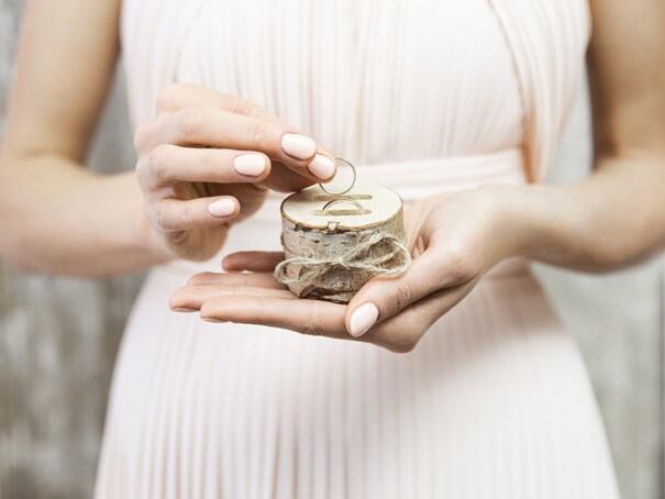 Coussin porte-alliances, présentation romantique des alliances pour le mariage. Coussin en toile de jute joliment décoré de roses rose clair.