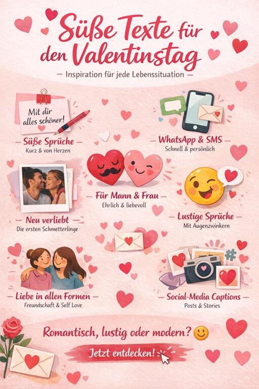 Ein Spruch sagt manchmal mehr als tausend Worte – besonders am Valentinstag. Egal ob du frisch verliebt bist, deinem Partner nach vielen gemeinsamen Jahren danken möchtest oder einfach ein Lächeln ins Gesicht zaubern willst: Mit dem richtigen Valentinstag Spruch machst du deine Botschaft unvergesslich. Hier findest du Inspiration für Karten, WhatsApp-Nachrichten oder kleine Liebesbotschaften, die von Herzen kommen.
