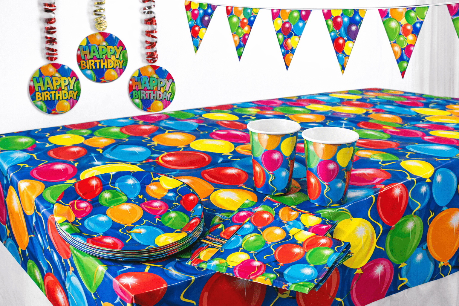 Mit diesem bunten Partyset ist dein Tisch im Handumdrehen perfekt dekoriert. Teller, Becher und Tischdecke sind farblich aufeinander abgestimmt und sorgen sofort für fröhliche Party-Stimmung.